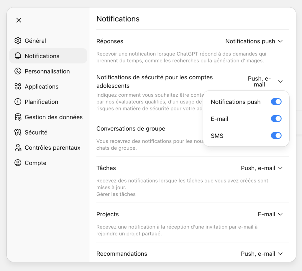 ⚠️ Important : si votre enfant utilise ChatGPT sans compte ou via le compte d’un adulte, le contrôle parental ne peut pas fonctionner.